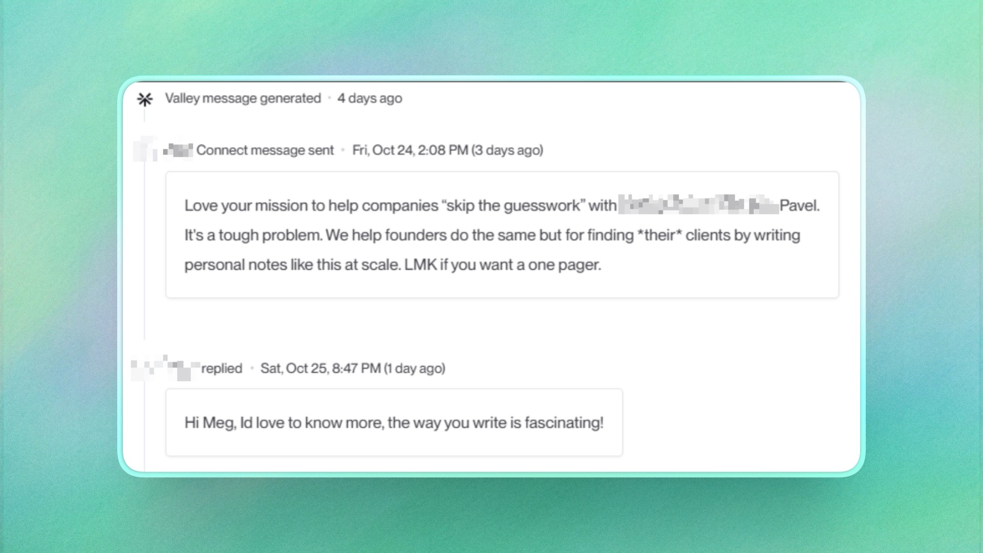Even for prospects with minimal LinkedIn activity or sparse digital footprints, Valley finds personalization angles. The platform looks beyond individuals to examine company-level signals, industry trends, competitive landscape, and peer company activities. Valley might find prospects quoted in trade publications, mentioned in company blogs, or listed in conference rosters.