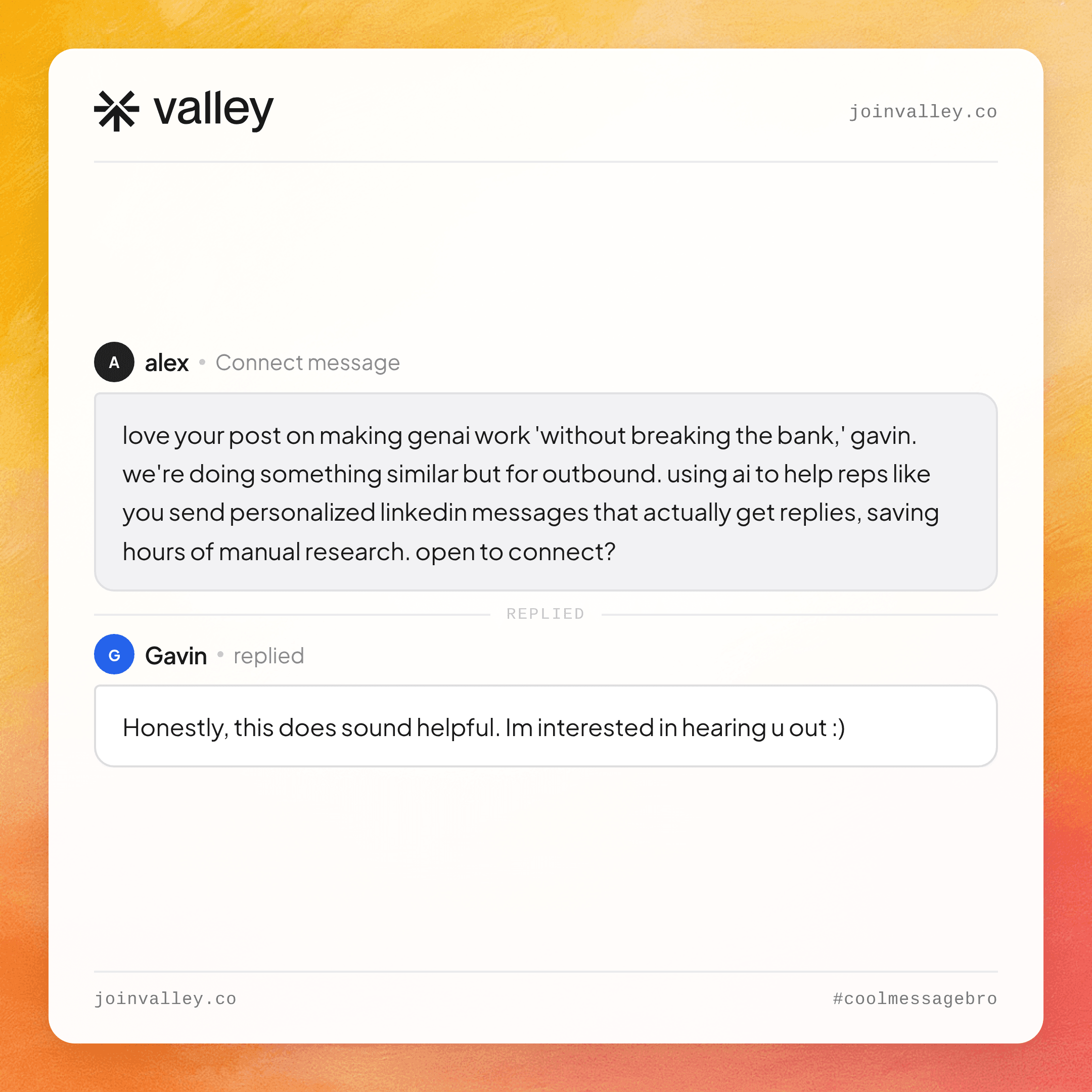 Highlight the Right Angle: Valley's AI analyzes why each prospect is interested—what page they visited, which post they engaged with, what challenge they're likely facing—and identifies the most relevant talking point.