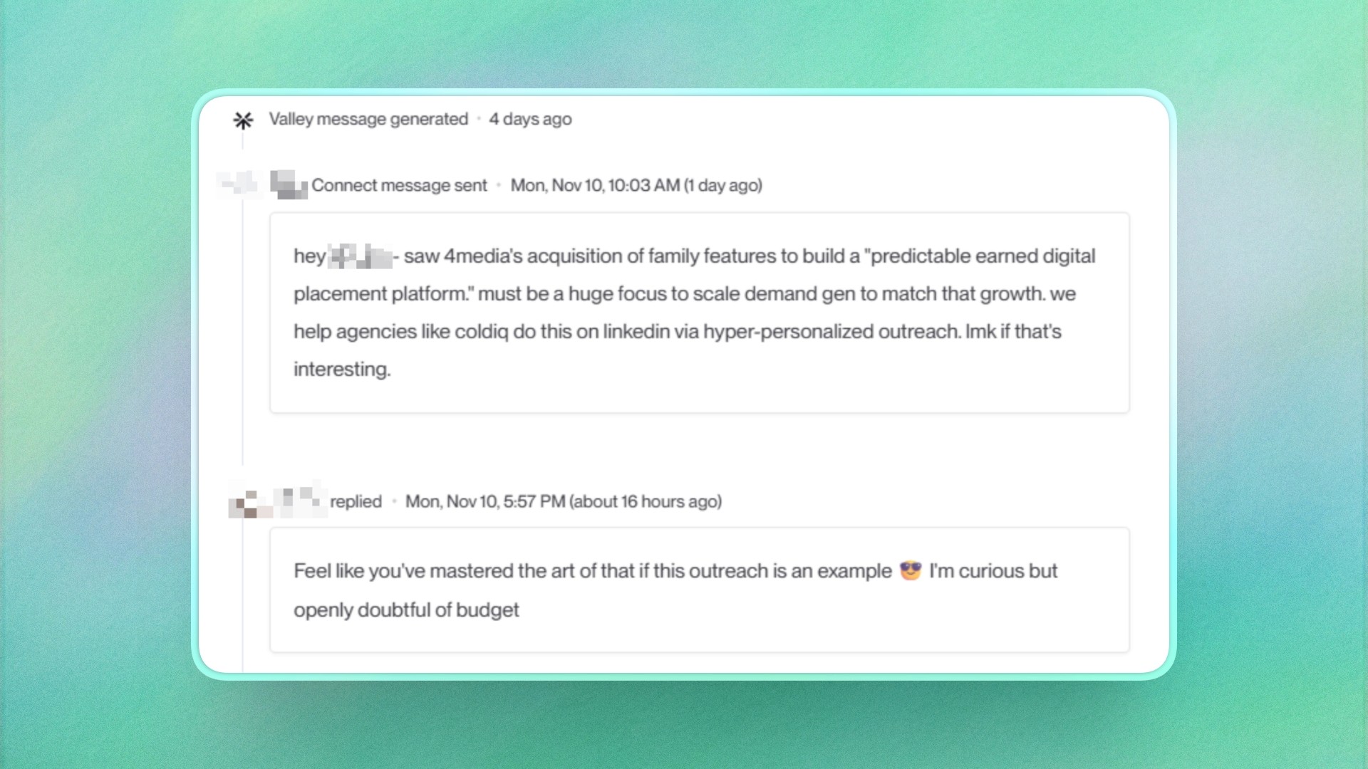 The key differentiator is Valley's deep personalization and research, making every message feel individually crafted rather than mass-produced.